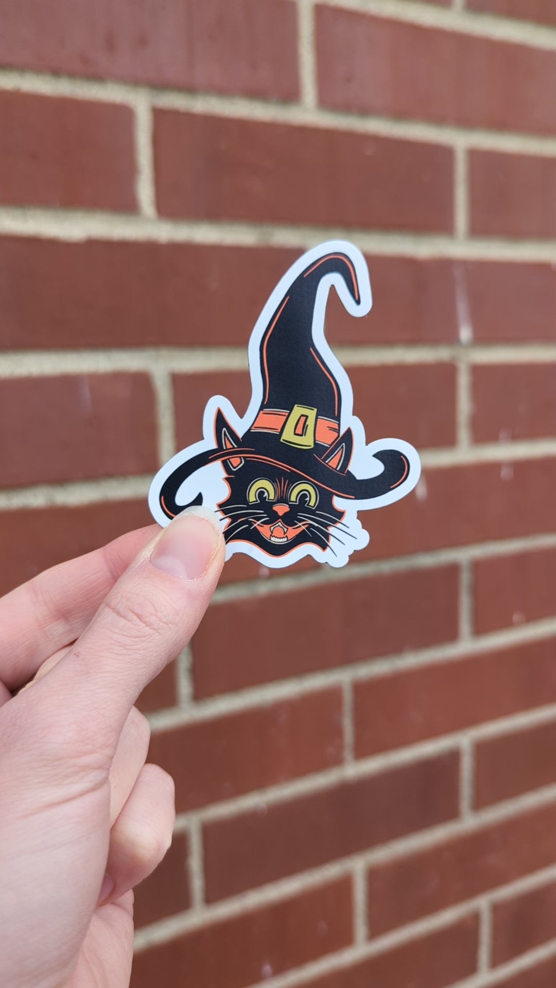 Elevate your Halloween decor with a touch of nostalgia with our vintage-inspired black cat magnet featuring an adorable feline friend donning a classic witch hat. This magnet captures the spirit of yesteryears, making it a delightful addition to your spooky festivities.